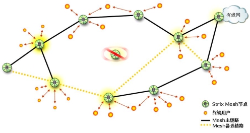 无线网络连接建立后形成mesh结构,每个网络节点以一定的时间间隔不断的执行决策算法。每个节点具有的分布式智能以信号强度和网络性能为指标,在多条无线链路中选取最优路径路由流量,并且不断动态调整数据路径,限制了广播并且消除了瓶颈。这保证了任何由于网络单元被增加或是移除导致的网络拓扑变化都可以立即被检测到并进行相关的措施,保证网络总是处于最优的性能和运行状态。这样,网络必须具备了以下两个自组网特性: