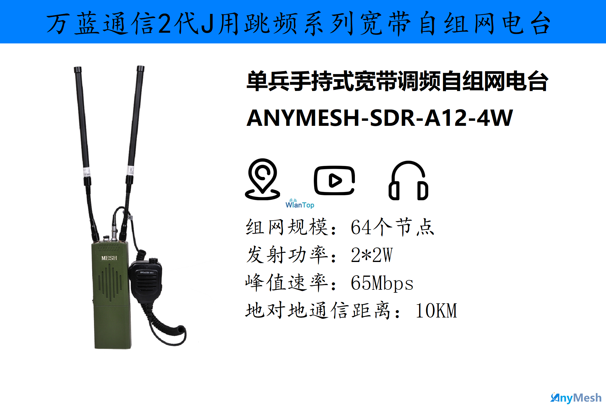 • ANYMESH-SDR-A12单兵手持式宽带跳频自组网电台(4W)