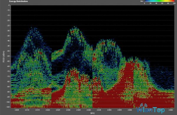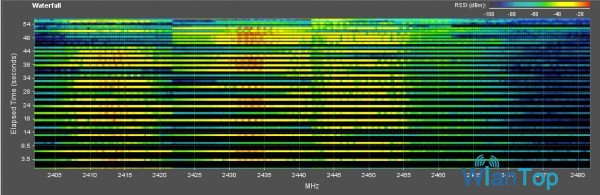 分析仪收集聚集体的能量,。以dBm的能量的功率跨越频率跨度所示。蓝色指能量相对低,越亮的颜色(绿、黄、橙、红)能量越高。随着时间的推移光谱视图将基本上显示给定的环境静态RF能量。
