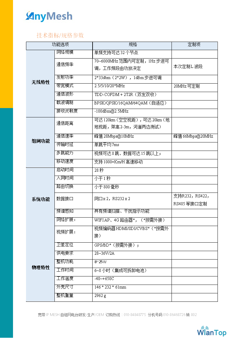 产品简介:AnyMESH-HR02-4W车载型自组网电台,发射频率范围为320M至1.5G可定制,采用万蓝通信新一代多跳自组网协议的无线电技术,具备对抗复杂信道环境能力,实现在复杂场景下完成单兵、车辆、无人机等机动点、固定点之间的无中心同频自组网宽带业务传输。设备本身内置大容量锂电池,设计紧凑,具备单通道2W,双通道4W 的发射功率,满足用户在紧急场景下快速建立专用网络,为用户的语音、消息、视频等 IP 数据 业务提供稳定的传输通道。