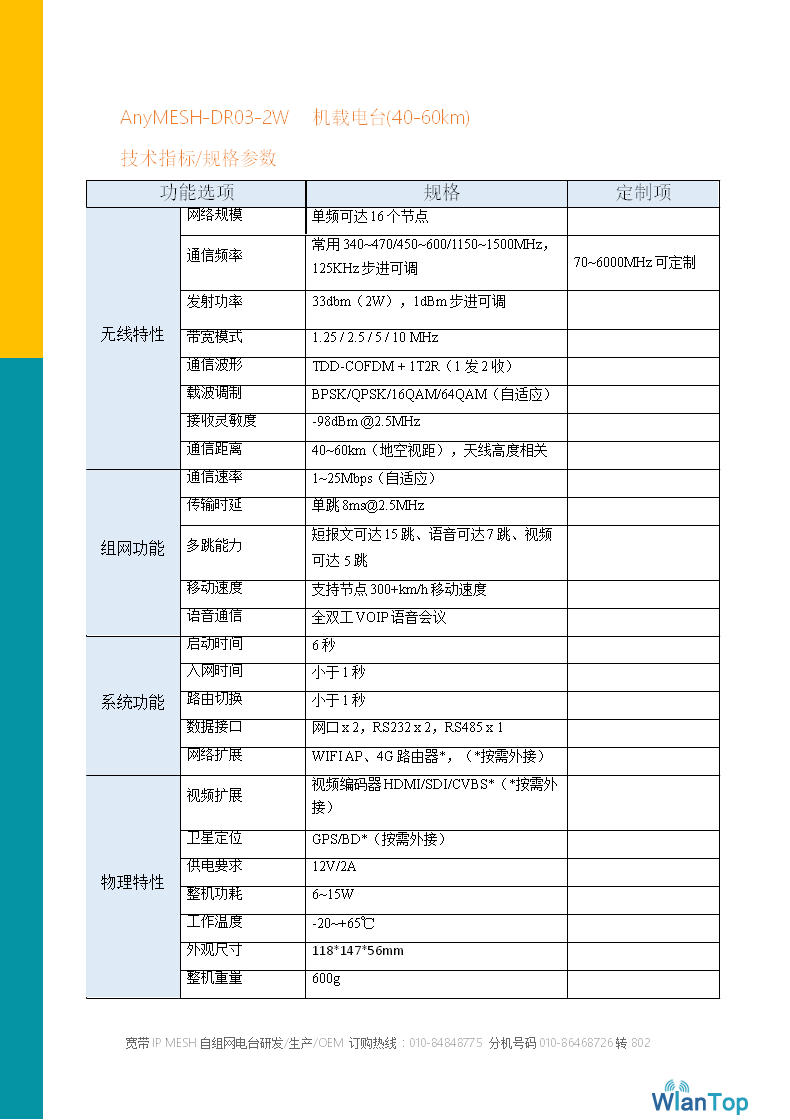 产品简介:AnyMESH-DR03-2W机载型航空自组网电台,发射频率范围为450M-600M/1.15G-1.5G可定制,采用万蓝通信新一代多跳自组网协议的无线电技术,具备对抗复杂信道环境的能力,实现在复杂场景下完成单兵、车辆、无人机等机动点、固定点之间的无中心同频自组网宽带业务传输。