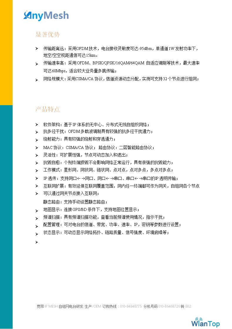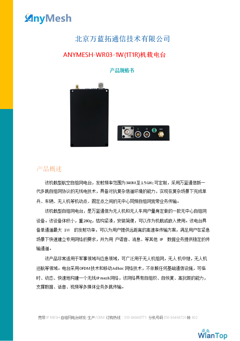 产品简介:AnyMESH-WR03-1W 机载电台15Km 该机载型航空自组网电台,发射频率范围为340M至1.5G可定制,采用万蓝通信新一代多跳自组网协议的无线电技术,具备对抗复杂信道环境的能力,实现在复杂场景下完成单兵、车辆、无人机等机动点、固定点之间的无中心同频自组网宽带业务传输。具备最大1W 的发射功率,满足用户在紧急场景下快速建立专用网络,为用户的语音、消息、视频等 IP 数据 业务提供稳定的传输通道。