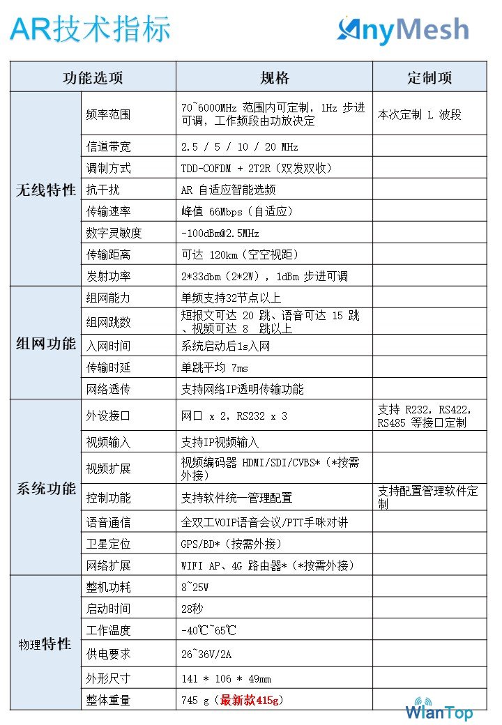 产品简介:AnyMESH-SR03-4W 机载电台 该机载型航空自组网电台,发射频率范围为400M-450M/1.35G-1.4G可定制,采用万蓝通信新一代多跳自组网协议的无线电技术,具备对抗复杂信道环境的能力,实现在复杂场景下完成单兵、车辆、无人机等机动点、固定点之间的无中心同频自组网宽带业务传输。